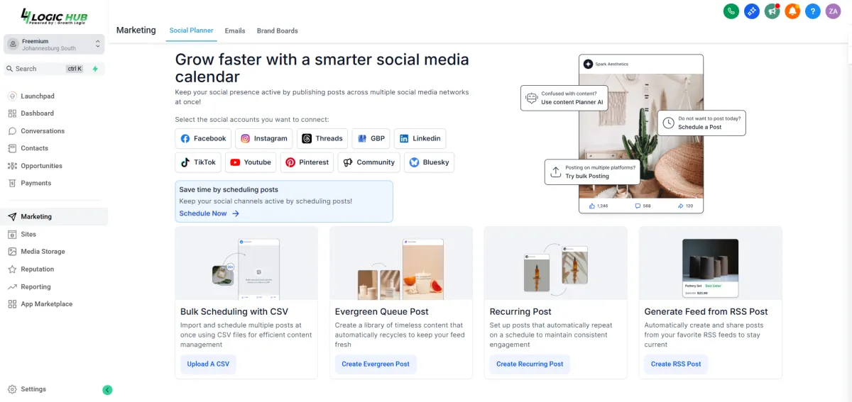 Logic Hub helps you stay active and consistent on social media without the stress. You can plan, schedule, and publish posts across Facebook, Instagram, LinkedIn, TikTok, and more, all from one dashboard. It keeps your audience engaged, your brand visible, and your content running even when you are busy. Save time, stay consistent, and let your social presence grow effortlessly.