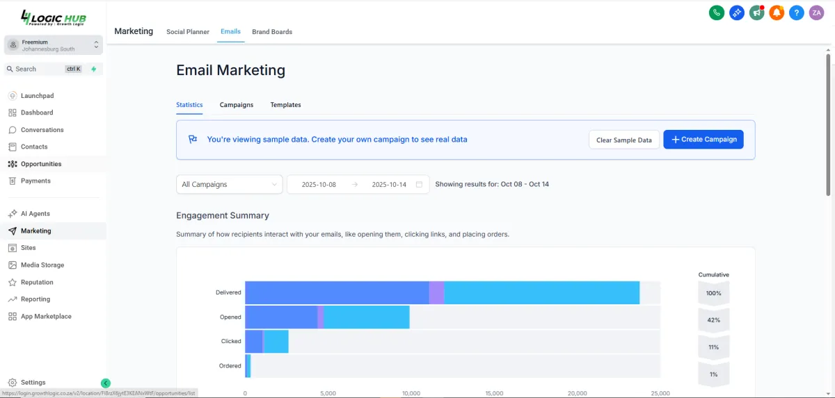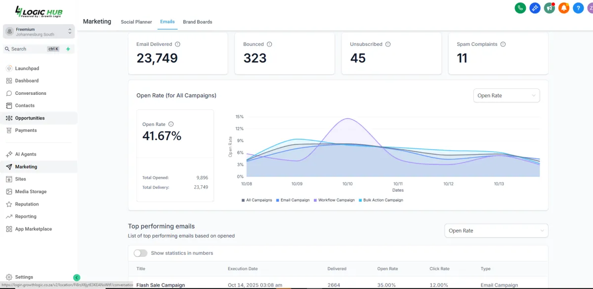 Logic Hub's marketing tools help you attract, engage, and convert more customers. You can send emails, manage campaigns, and track results without switching apps. It saves you time, keeps your audience engaged, and helps you see what’s really working so you can grow faster and smarter.